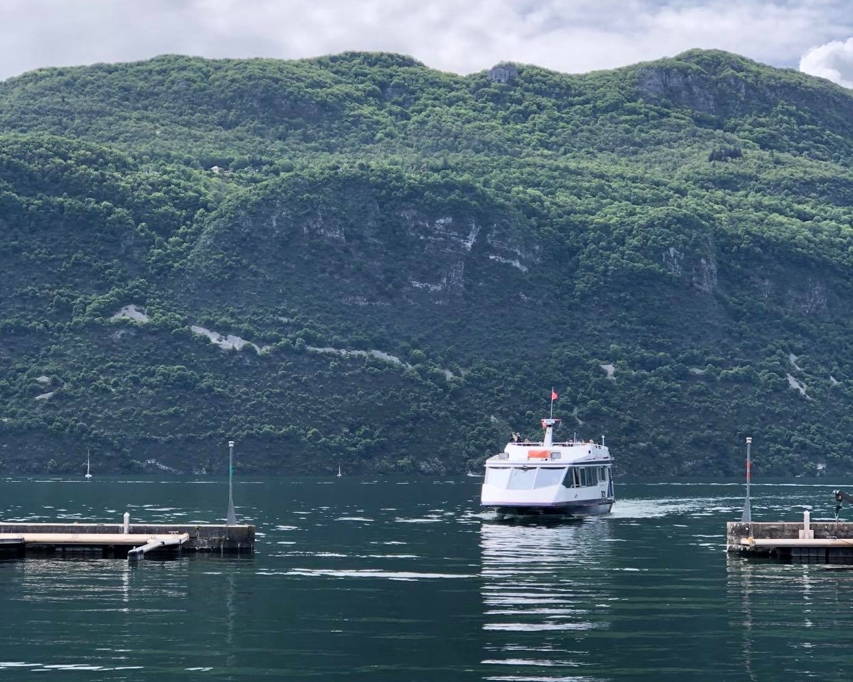 Au déjeuner, le panorama sauvage des rives du lac, au coeur du massif des Alpes, défile devant vos yeux.